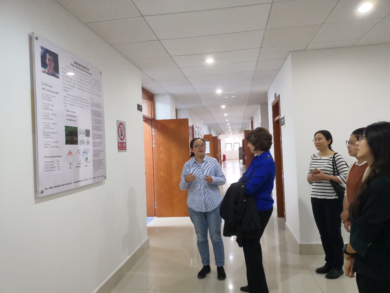 在杨崇林老师的程序性细胞死亡及溶酶体和线粒体的调控研究课题组,尹秋媛老师向Dr.Beverly Pumell介绍,实验室目前利用秀丽线虫和哺乳动物细胞对细胞内亚细胞器,溶酶体及线粒体的稳态调节开展研究。