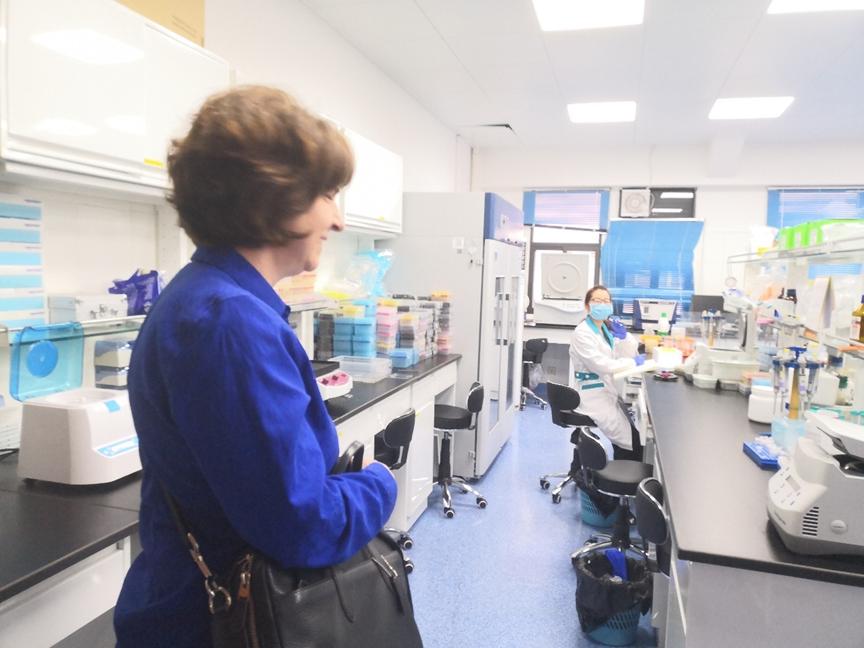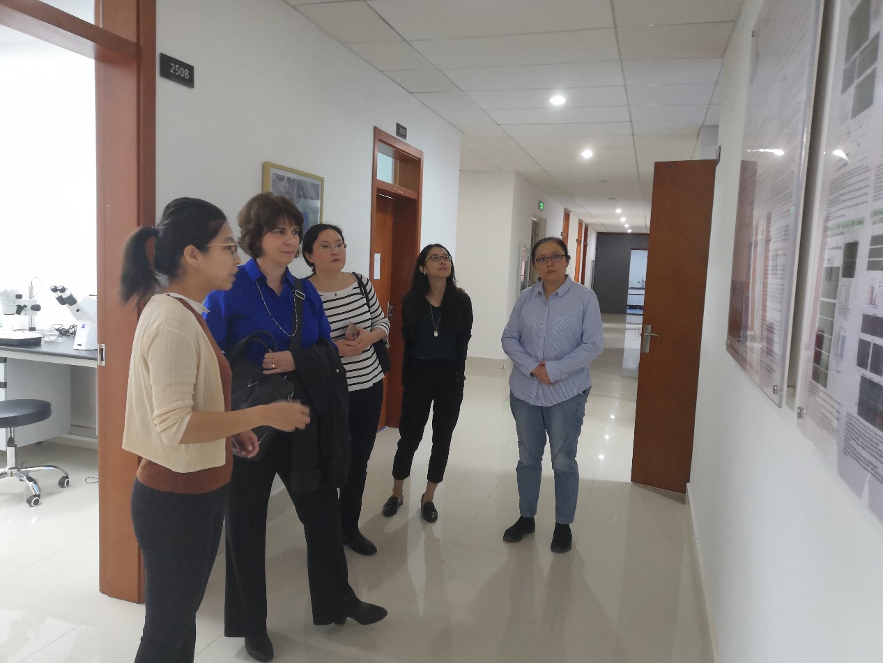 Dr.Beverly Pumell走进张建老师的脊椎动物早期胚胎发育及干细胞研究课题组,贲进老师介绍实验室目前主要从事卵母细胞中母源因子对胚胎早期发育影响的研究,特别是对这些因子如何调控生殖质的形成和原始生殖细胞的发生与分化有莫大兴趣。随后,一行参观了斑马鱼房、中心公共显微成像平台。
