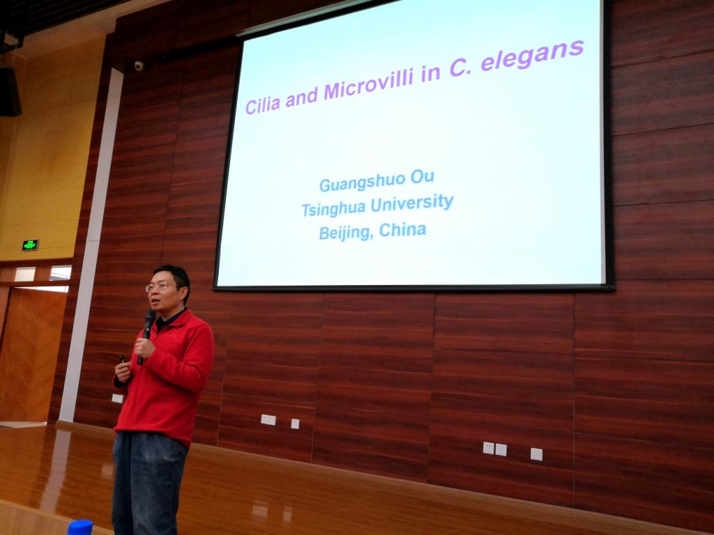 首先欧光朔研究员作了题为“Cillia and microvilli in C. elegans”的学术报告。欧光朔研究员是国家杰出青年科学基金获得者,现任清华老员工命科学公司副经理。欧光朔研究员带领的课题组主要以线虫的Q神经前体细胞为对象,研究细胞骨架和信号转导蛋白如何调控神经系统的发育。相关研究成果发表在Nature、Science、JCB、PNAS、Development、Nature Biotechnology、Development Cell、Current Biology等国际著名学术期刊。此次报告中,欧光朔研究员从线虫的Q神经前体细胞讲起,通过利用活体荧光显微成像这一方法在细胞器和分子水平上记录Q细胞发育过程,阐述了细胞骨架和信号转导蛋白如何调控神经系统的发育。其对Q神经前体细胞从不对称分裂、长距离迁移、细胞凋亡到神经丝的行程最终产生的触觉神经元和中间神经元的发育过程进行了详细地阐述。同时还系统介绍了其课题组关于纳米绒毛的发现及研究思路,通过单细胞测序、转录组等分析手段探究其功能。欧老师把他的研究工作讲成了一个有趣的故事呈现给了听众。