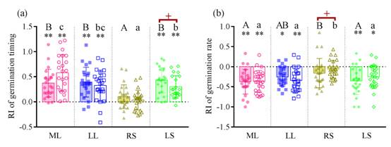 图2 紫茎泽兰两个入侵时期的植物—土壤—叶反馈作用延长了种子萌发时间和降低了种子萌发率。ML:成熟叶;LL:枯叶;RS:根际土;LS:土壤+叶的综合反馈。实心图标:入侵80年;空心图标:入侵20年。摘自Fang et al, 2019, Plant-soil-foliage feedbacks on seed germination and seedling growth of the invasive plant Ageratina adenophora. Proceedings of the Royal Society B.