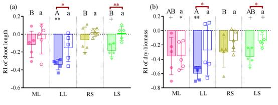 图3 紫茎泽兰两个入侵时期的植物—土壤—叶反馈“遗产”降低了幼苗的茎长和生物量干重。图注同图1。摘自Fang et al, 2019, Plant-soil-foliage feedbacks on seed germination and seedling growth of the invasive plant Ageratina adenophora. Proceedings of the Royal Society B.