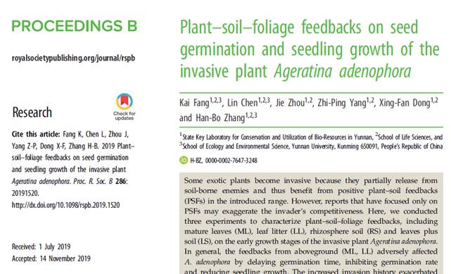 2019年12月11日,Nature Index收录期刊、英国皇家学会学术刊物Proceedings of the Royal Society B(简称Proceedings B)在线发表了公司生物资源保护与利用国家重点实验室,生命科公司张汉波课题组独立完成的题为“植物—土壤—叶反馈对入侵植物紫茎泽兰种子萌发和幼苗生长的影响”(Plant-soil-foliage feedbacks on seed germination and seedling growth of the invasive plant Ageratina adenophora)的研究论文。本文的研究者利用独特的实验设计,首次综合、系统评价了来源于根际土壤、地上叶组织的微生物对在中国西南地区,特别是云南省广泛入侵的恶性杂草紫茎泽兰(图1)在早期生长阶段所受到的反馈作用。该文以太阳成集团tyc122ccvip为独立完成单位,生态学与环境公司2017级在读博士研究生方楷为第一作者,张汉波教授为通讯作者。论文连接:http://dx.doi.org/10.1098/rspb.2019.1520.