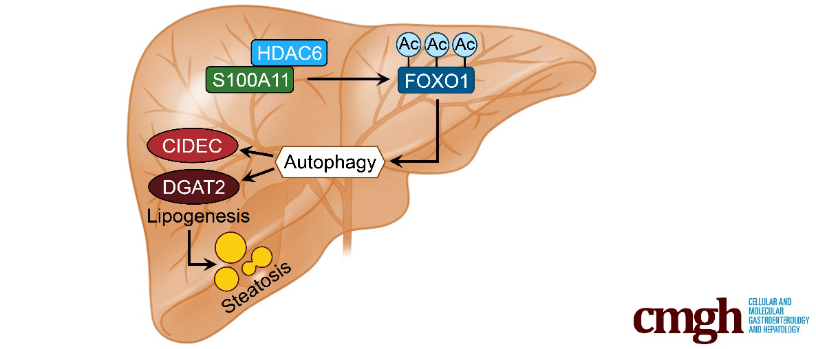 图1. S100A11-HDAC6-FOXO1轴调控肝脏脂肪变性的模式图