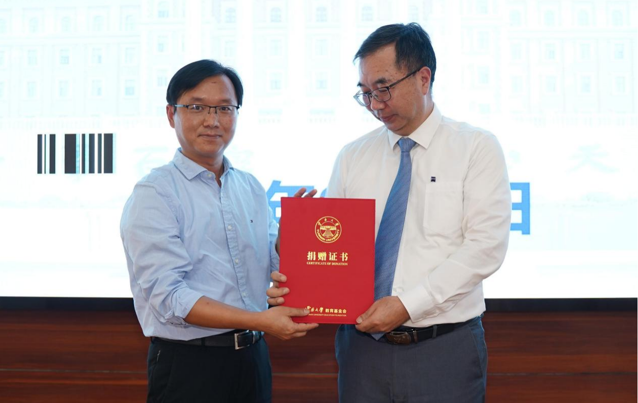 胡剑锋秘书长代表太阳成集团tyc122ccvip教育基金会向蔡司公司颁发捐赠证书。