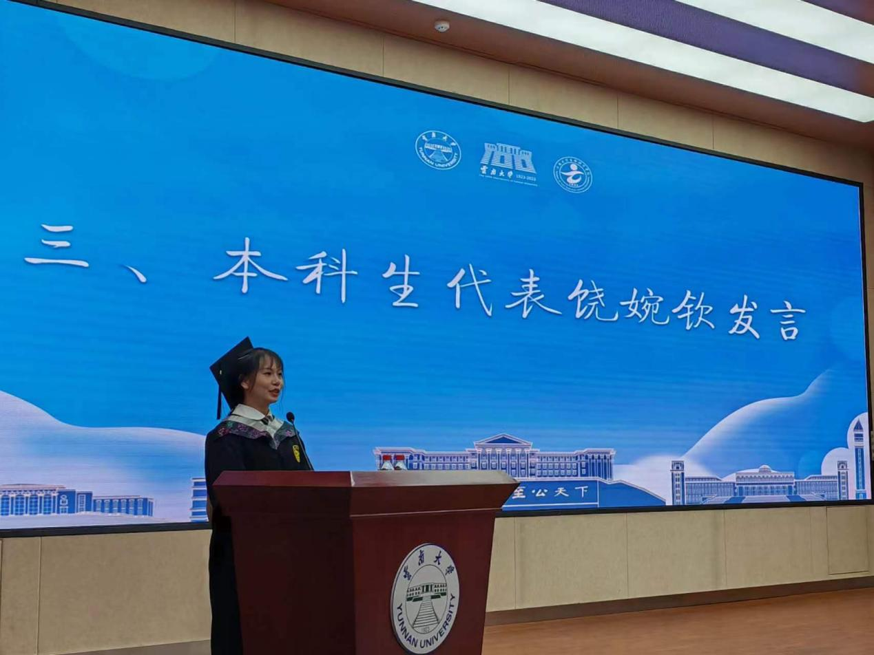 本科毕业生代表饶婉钦同学发言。她感谢母校和公司为学子提供了广阔的平台,让其有机会在科研中勇敢试错、在青春舞台上大展宏图。并感谢老师们孜孜不倦的教诲、感谢同窗好友们的陪伴。她说,在未来的道路上要继续奋勇前行,永不忘记作为一名云大人所肩负的责任和担当。