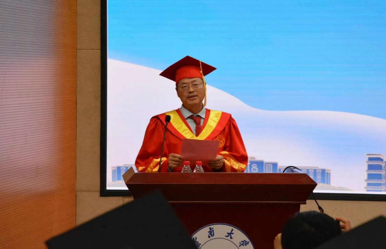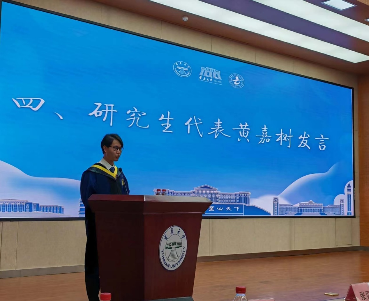 硕士研究生毕业生代表黄嘉树同学发言。黄嘉树同学分享了他与云大的故事,在这里,他收获了追逐理想的勇气和力量,传承了师长们爱岗敬业和奋力拼搏的精神。在未来,他将努力践行“自尊、致知、正义、力行”的云大校训,担负新时代青年人的使命,把奋斗融于伟大时代,把才识献于伟大时代,为建设社会主义现代化强国贡献自己的青春和力量。
