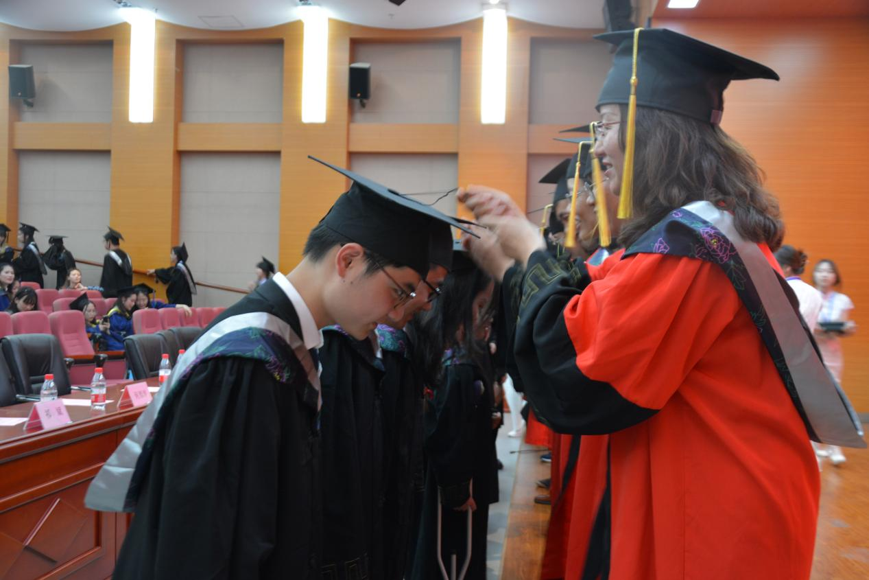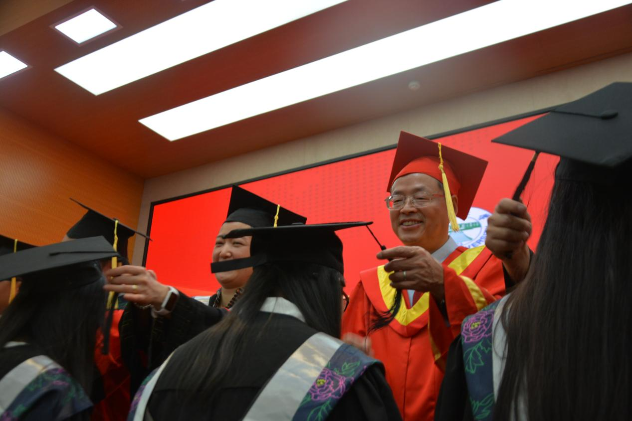 经理同导师代表身着红袍陆续上台,与同学们共同完成拨穗礼环节,并将毕业证郑重的交到同学们手里,同时还不忘询问同学们的情况,眼神里满满都是关心与祝贺。