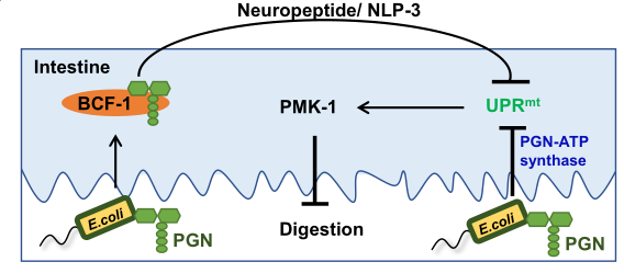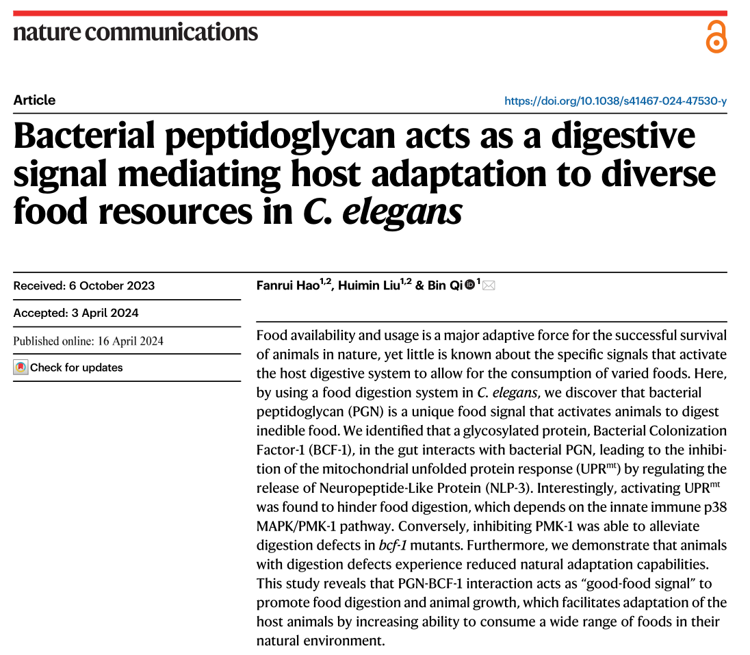 2024年4月16日,太阳成集团tyc122ccvip中心祁斌研究组在Nature Communications上以“Bacterial peptidoglycan acts as a digestive signal mediating host adaptation to diverse food resources in C. elegans”为题,报道了一种启动食物消化的信号——细菌肽聚糖(PGN),它通过与糖基化蛋白BCF-1互作抑制线粒体未折叠蛋白反应(UPRmt)促进消化,从而提升线虫自然适应能力。