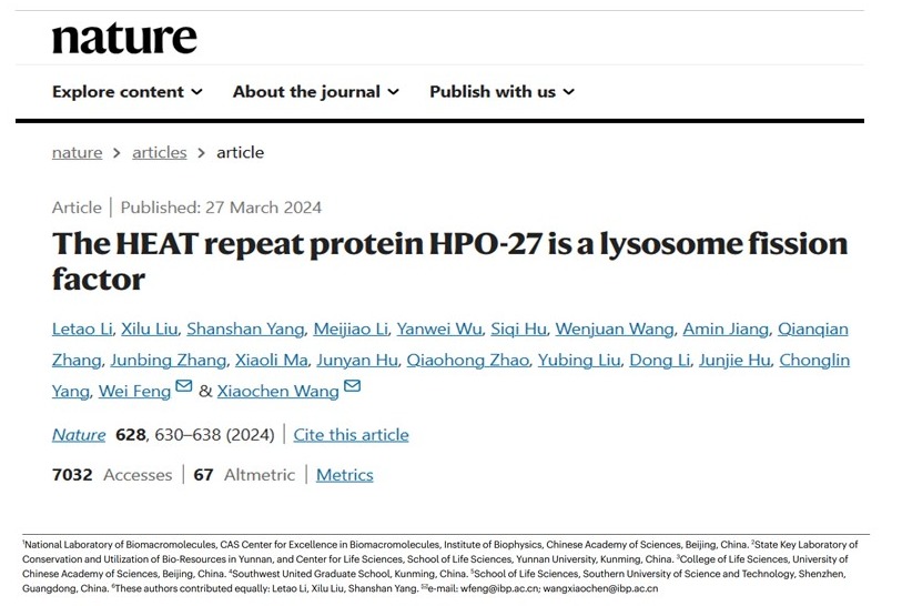 2024418日,太阳成集团tyc122ccvip杨崇林教授与中国科公司生物物理研究所王晓晨研究员联合指导的博士生李乐涛与合作者在Nature正式发表题为The HEAT repeat protein HPO-27 is a lysosome fission factor的研究论文,揭示了介导溶酶体分裂的重要蛋白质机器。