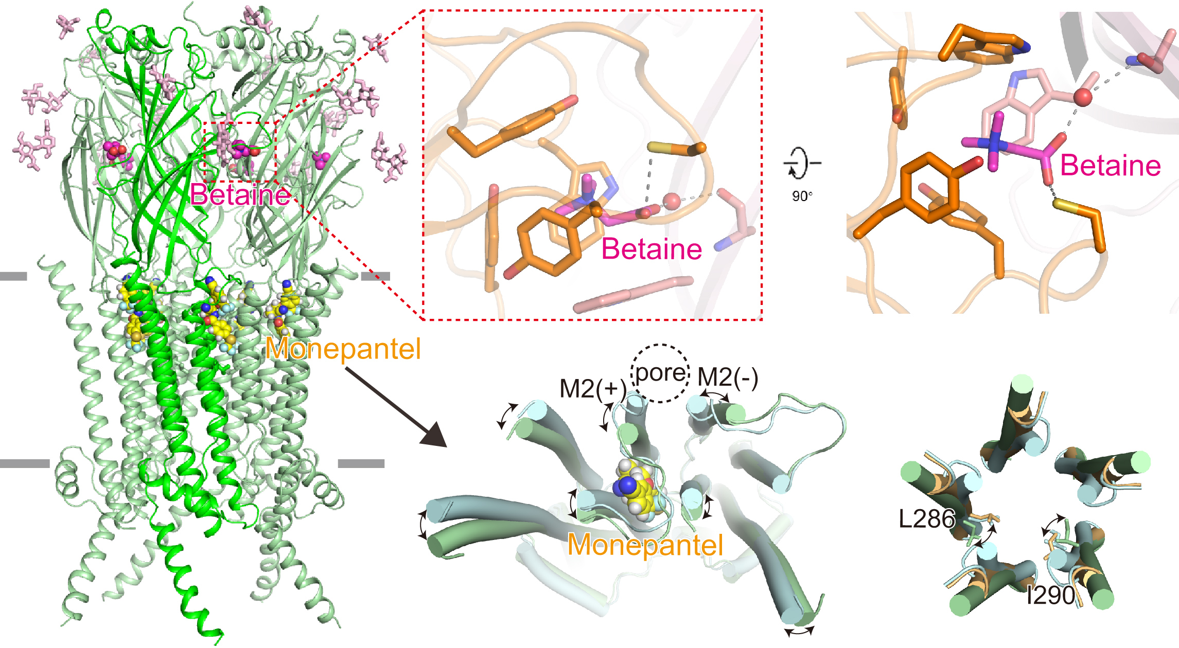 该研究解析了秀丽隐杆线虫ACR-23在apo态、betaine结合态、betaine&monepantel结合态的冷冻电镜结构。ACR-23与其他Cys-loop家族LGICs一样形成同源五聚体,并在对称轴上形成离子传导通路。每个单体含1个几乎完全由β片层组成的细胞外结构域(ECD),1个具有4个TM螺旋(M1-M4)的跨膜结构域(TMD)和1个大部分均无序的细胞内结构域(ICD)。Betaine以几乎与膜平行的姿态,在水分子的参与下结合到相邻亚基ECD间的界面上;然而,结合了betaine的ACR-23结构并没有打开(可能处于开放前或脱敏态)。而Monepantel分子则嵌入到相邻亚基TMD间的界面上,其结合口袋主要由M2螺旋、M3螺旋、M2-M3 loop和Cys loop,以及相邻亚基的M1螺旋所形成。Monepantel锚定在M1和M3之间,拉动M2向外远离中心孔,同时使M2发生轻微旋转,引起Leu 286和Ile 290等原本堵塞离子传导孔的残基侧链偏离孔中心,最终导致离子传导孔打开。
