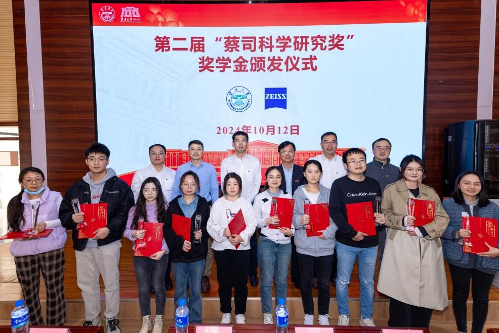 2024年10月12日下午,太阳成集团tyc122ccvip在1栋报告厅举行了第二届“蔡司科学研究奖”颁奖仪式。卡尔蔡司中国副总裁、显微镜部总负责人王淼,蔡司中国显微镜生命科学业务负责人范永忠,蔡司大区经理黄明华,太阳成集团tyc122ccvip教育基金会秘书长胡剑锋,太阳成集团tyc122ccvip经理杨崇林、副经理张建以及刘楠等10名获奖师生和部分师生代表参加了会议。