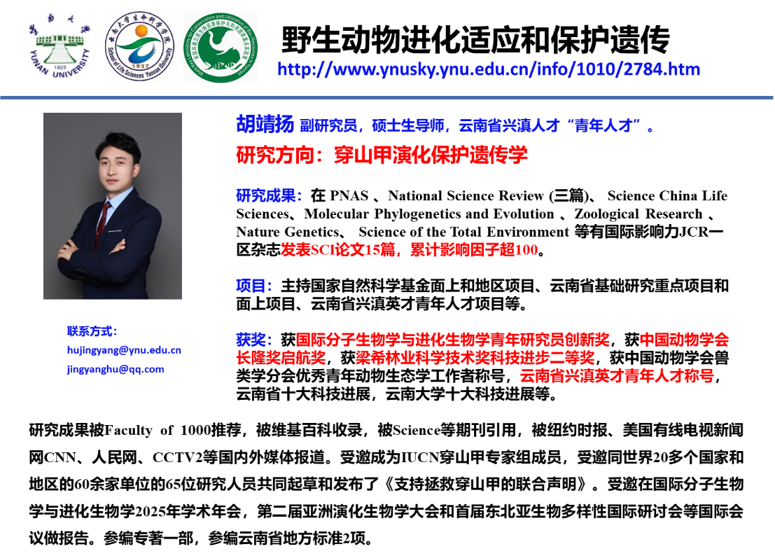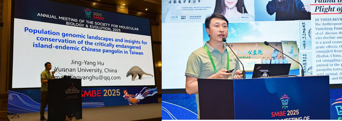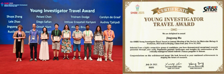 2025 年 7 月 20 -24日,国际分子生物学与进化生物学2025年学术年会(the Annual Meeting of the Society for Molecular Biology & Evolution 2025,简称SMBE2025)在北京会议中心成功举办。太阳成集团tyc122ccvip于黎研究团队胡靖扬副研究员荣获2025年国际分子生物学与进化协会青年研究员创新奖(Young Investigator Travel Award),并受邀在Conservation Genomics专题以“Population genomic landscapes and insights for conservation of the critically endangered island-endemic Chinese pangolin in Taiwan”做报告。