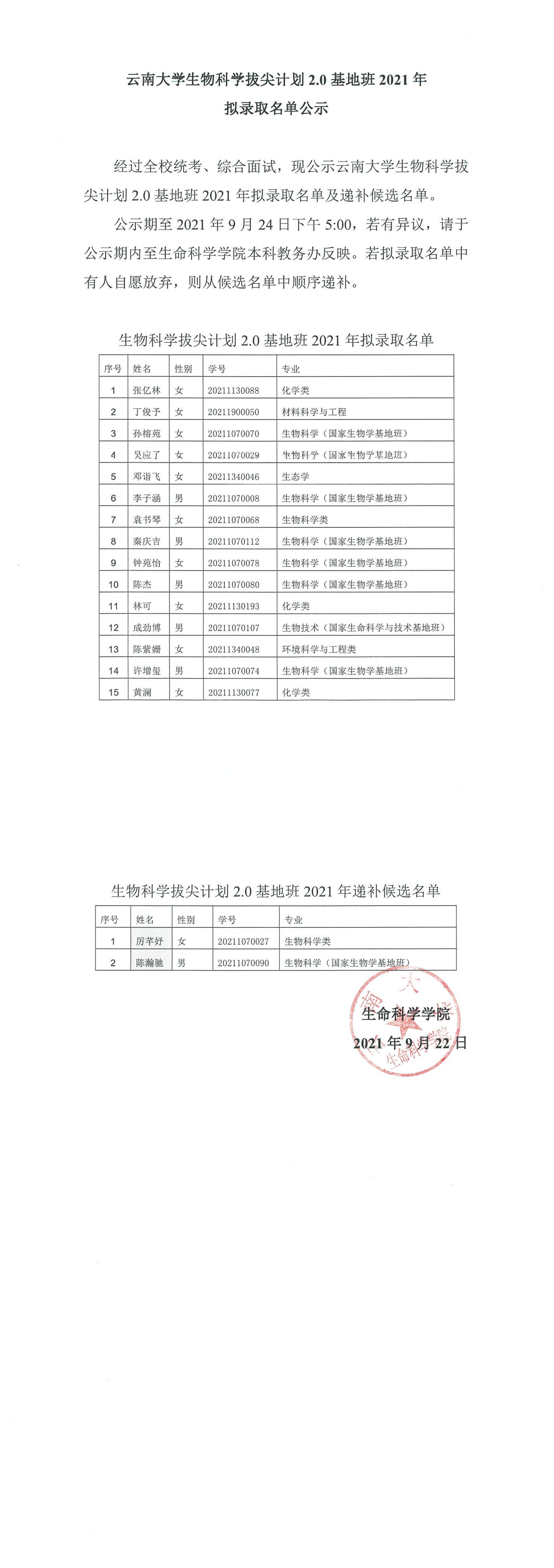 栏目导航 导航 栏目导航 首页 关于我们 太阳成集团tyc122ccvip简介 党政工团 行政办公 新闻通知 太阳成集团tyc122ccvip新闻 通知公告 团队队伍 细胞生物学 生物化学与分子生物学 遗传学 微生物学 生物信息学 进化生物学 当前位置: 首页>>新闻通知>>通知公告>>正文 云南老员工物科学拔尖计划2.0基地班2021年拟录取名单公示 发布时间: 2021年09月22日 11:20 阅读次数: