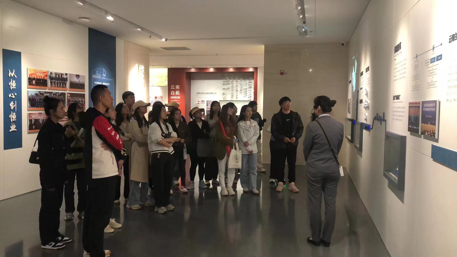 师生在讲解员带领下参观白药集团总部展厅,解说员对集团的历史沿革、创新发展、研发突破、企业文化等方面做了详细的介绍。白药集团博物馆内部展品丰富,师生领略了120年云南白药的悠久品牌文化。