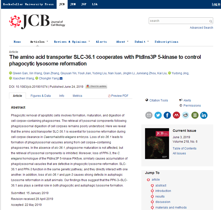 Phagocytic removal of apoptotic cells involves formation, maturation,and digestion of cell corpse–containing phagosomes.The retrieval of lysosomal components following phagolysosomal digestion of cell orpses remains poorly understood.Here we reveal that the amino acid transporter SLC-36.1 is essential for lysosome reformation during cell corpse clearance in Caenorhabditis elegans embryos. Loss of slc-36.1 leads to formation of phagolysosomal vacuoles arising from cell corpse–containing phagosomes.In the absence of slc-36.1,phagosome maturation is not affected,but the retrieval of lysosomal components is inhibited.Moreover, loss of PPK-3, the C. elegans homologue of the PtdIns3P 5-kinase PIKfyve, similarly causes accumulation of phagolysosomal vacuoles that are defective in phagocytic lysosome reformation. SLC-36.1 and PPK-3 function in the same genetic pathway,and they directly interact with one another.In addition,loss of slc-36.1 and ppk-3 causes strong defects in autophagic lysosome reformation in adult animals. Our findings thus suggest that the PPK-3–SLC-36.1 axis plays a central role in both phagocytic and autophagic lysosome formation.