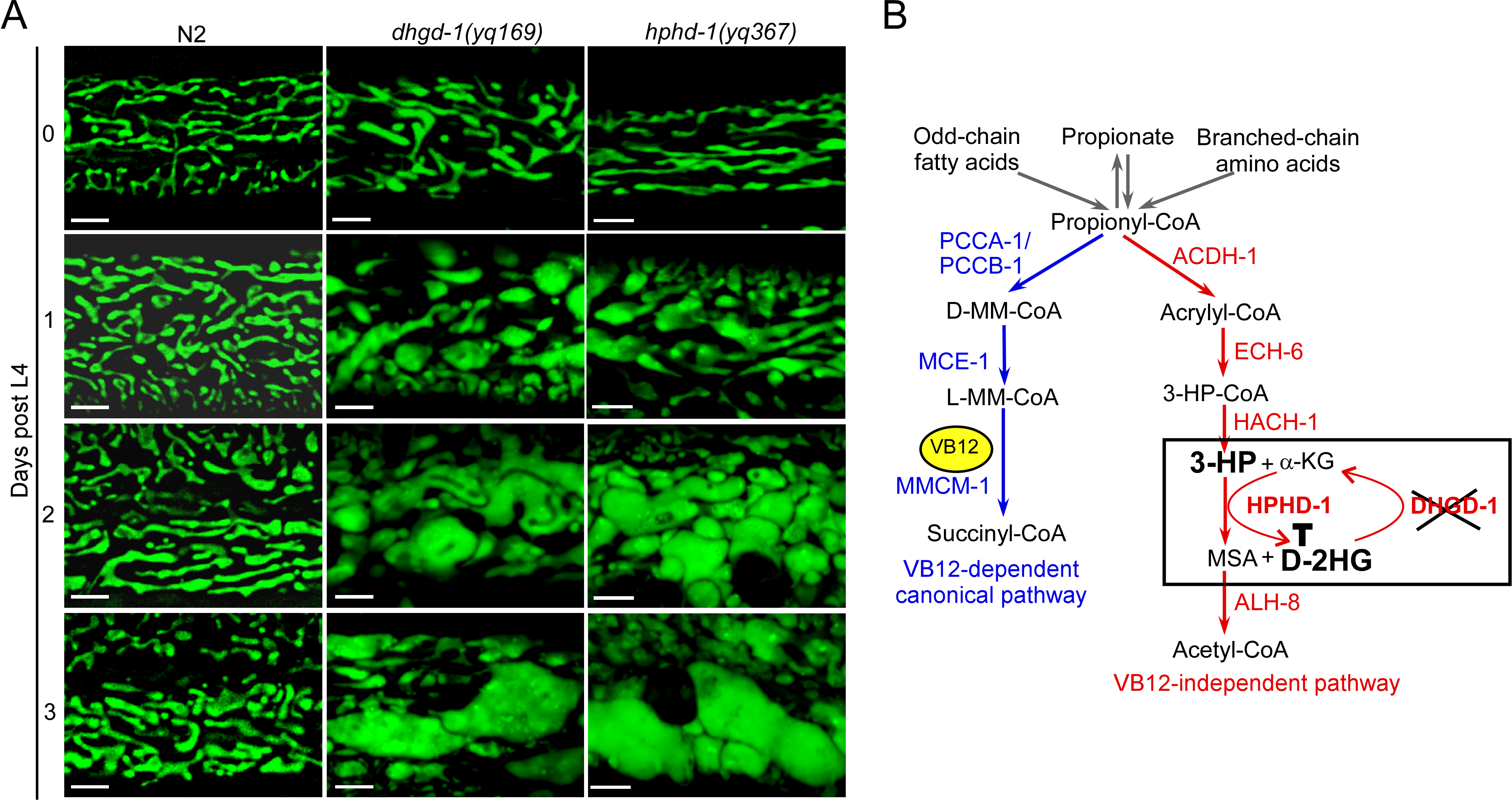 图1. A 线虫中编码D-2HG脱氢酶的基因dhgd-1的突变和3-HP脱氢酶基因hphd-1的突变导致线粒体结构异常。B 线虫支链氨基酸、丙酸、奇数链脂肪酸的代谢通路:依赖于VB12经典通路和不依赖于VB12 的通路。线虫在饲喂缺乏维生素 B12 的大肠杆菌 OP50(B-type E. coli)条件下,丙酸的分解代谢主要通过不依赖于VB12 的通路进行。在此代谢过程中,dhgd-1的功能缺失导致D-2HG的过量累积,D-2HG结合并抑制3-羟基丙酸脱氢酶(HPHD-1)的活性,进而造成3-HP的累积。