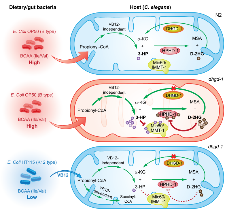 图2 饮食/肠道细菌影响丙酸代谢中间物D-2HG和3-HP损伤线粒体的机制模型。在饲喂缺乏维生素 B12 的大肠杆菌 OP50(B-type)的线虫中,丙酸分解代谢主要经不依赖于VB12 的通路进行。其中,HPHD-1蛋白以3-HP和α-KG作为共同底物,生成丙二酸半醛(MSA)和D-2HG, 后者随即通过DHGD-1蛋白催化生成α-KG,避免D-2HG在体内过度累积(上)。在dhgd-1突变体中,过量累积的D-2HG对HPHD-1产生反馈抑制,导致3-HP的累积。过多的3-HP结合Mic60/IMMT-1蛋白,抑制其与线粒体内膜结合和内嵴形成,导致线粒体的损伤(中)。HT115大肠杆菌(K12-type)通过激活依赖于VB12的丙酸代谢通路,以及减少宿主的丙酸(支链氨基酸)等方式,抑制宿主3-HP的产生,从而改善线粒体的结构与功能(下)。