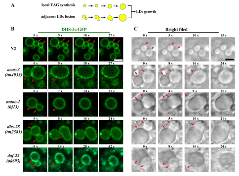 图1 脂滴融合过程:(A)脂滴生长方式示意图。脂滴蛋白DHS-3标记(B)及白光(C)拍摄的相邻脂滴融合过程图。标尺2 μm.