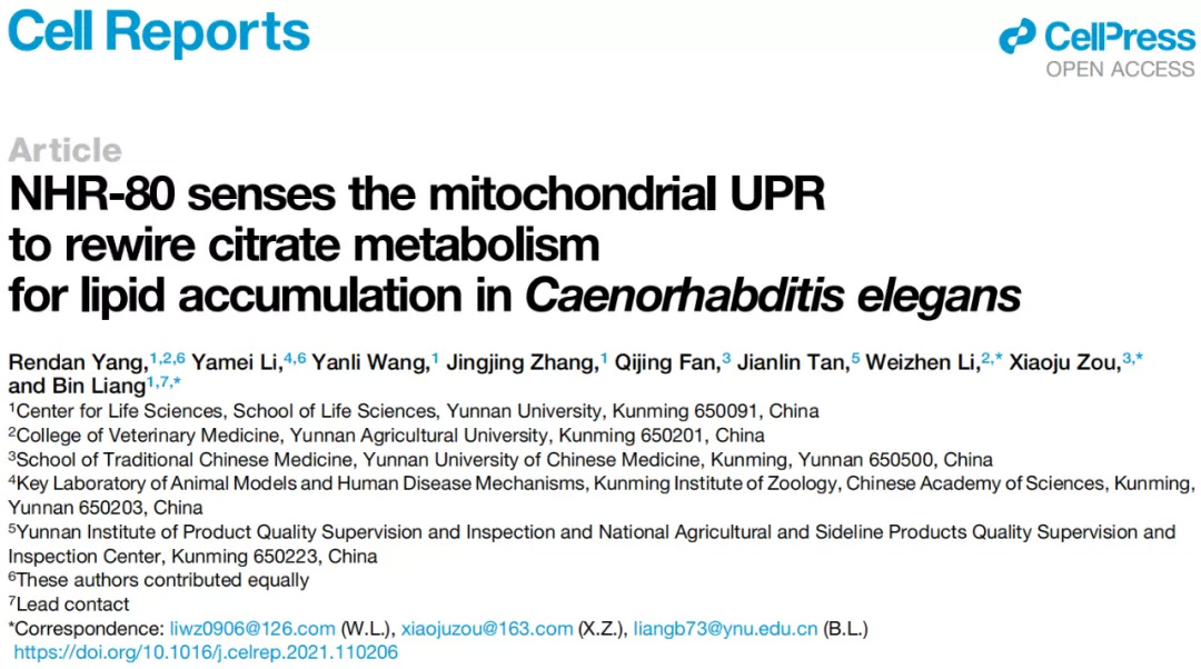 2022年1月11日,Cell Reports(五年影响因子10.394)发表了太阳成集团tyc122ccvip/中心梁斌研究员实验室题为“NHR-80 senses the mitochondrial UPR to rewire citrate metabolism for lipid accumulation in Caenorhabditis elegans”的研究论文,发现抑制线粒体TCA循环导致柠檬酸累积,特异性地激活线粒体非折叠蛋白反应(Mitochondrial unfolded protein response,UPRmt)与脂质累积,核受体因子NHR-80响应柠檬酸引起的UPRmt,把累积的柠檬酸转化为脂质储存。