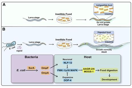 发现新的食物消化调控机制:肠道大肠杆菌膜蛋白通过神经-免疫对话激活动物消化食物。神经肽和神经递质等物质可以调节动物的一系列摄食行为。为了探究神经信号是否参与了食物消化过程,作者筛选了神经肽、多巴胺受体,发现大肠杆菌膜蛋白OmpA/F通过激活神经肽NLP-12促进线虫消化食物。已有研究表明NLP-12作用于受体CCKR-1,是哺乳动物胆囊收缩素的同源物,在奖赏行为中受到多巴胺信号的调节。通过本研究发现缺失多巴胺受体或添加多巴胺拮抗剂会抑制依赖于OmpA/F蛋白调控的消化。并且多巴胺及NLP-12-CCKR-1通过抑制先天免疫p38/PMK-1来激活食物消化系统。最后,本研究通过RNAi筛选潜在的糖苷酶基因,发现大肠杆菌激活消化系统依赖于糖苷酶AAGR-2、AAGR-4MOGS-1,且抑制p38/PMK-1也是通过激活上述糖苷酶来促进线虫对于SS食物的消化。