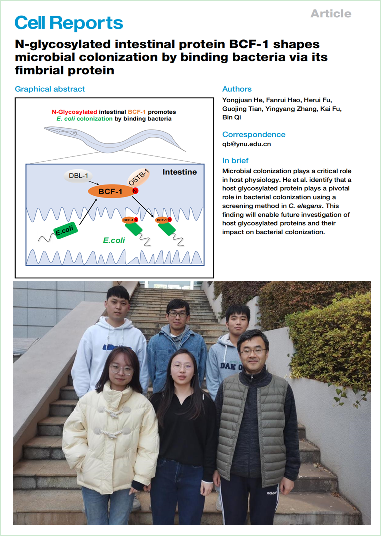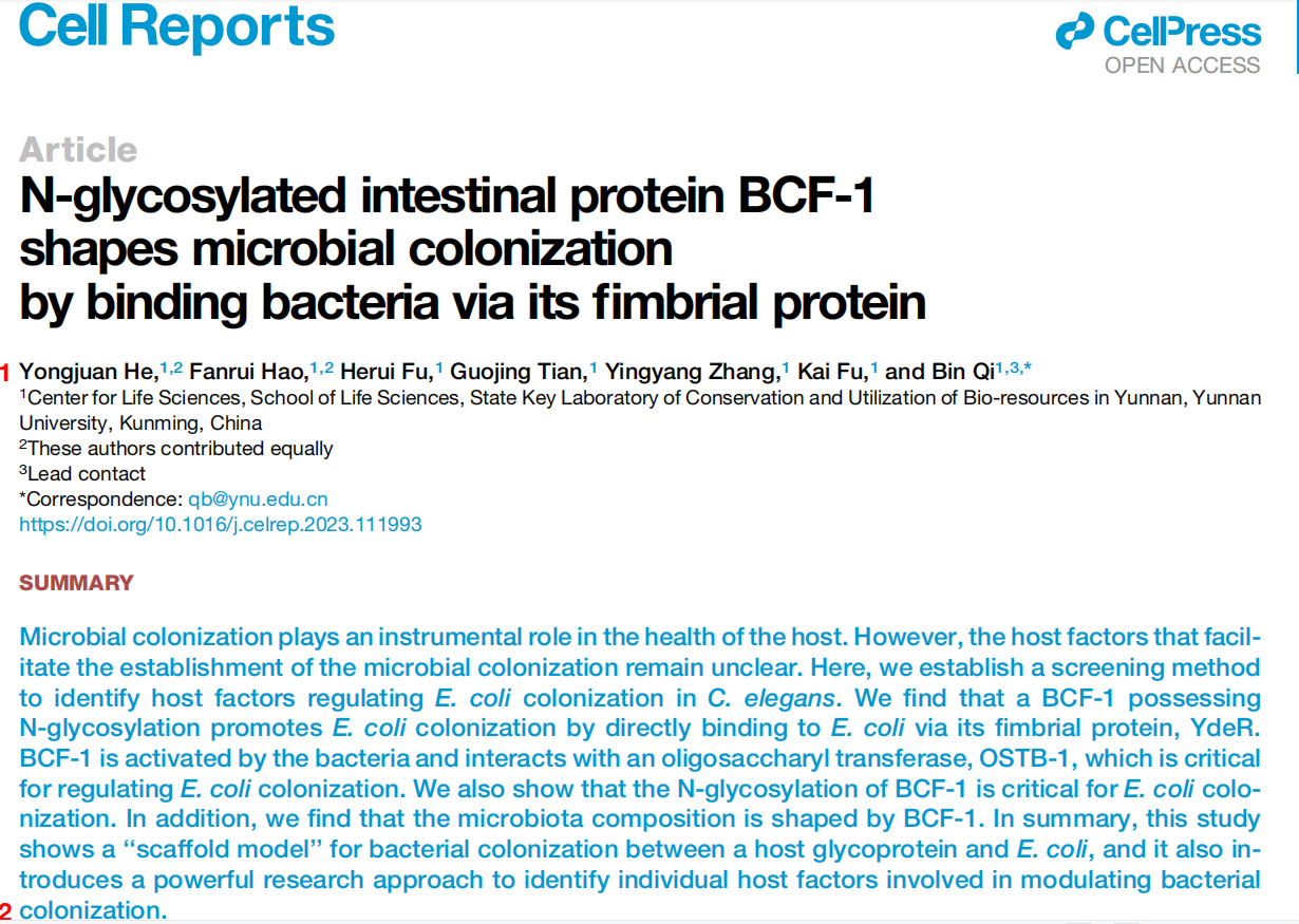 2023年1月18日,太阳成集团tyc122ccvip中心祁斌课题组在Cell Reports上以“N-Glycosylated Intestinal Protein BCF-1 Shapes Microbial Colonization by Binding Bacteria via its Fimbrial Protein”为题,报道了宿主N-糖基化蛋白BCF-1通过与细菌菌毛蛋白互作调控肠道菌定植的机制。