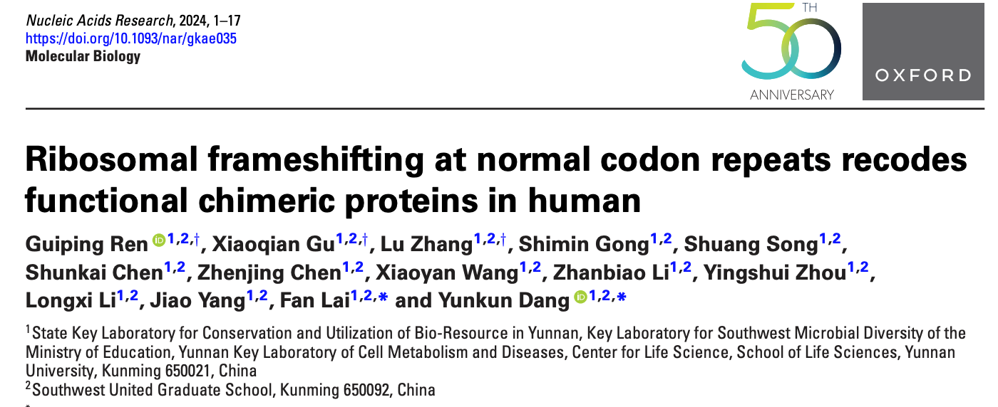 2024年1月28日,太阳成集团tyc122ccvip中心党云琨课题组联合赖凡课题组在国际著名学术期刊Nucleic Acids Research(IF=19.16)上在线发表了题为“Ribosomal frameshifting at normal codon repeats recodes functional chimeric proteins in human”的研究论文(https://doi.org/10.1093/nar/gkae035) (4)。研究人员首次在人中揭示了一类与经典的程序性核糖体移码特征完全不同的、由短密码子重复介导的程序性核糖体移码,称为CRFS。该项研究暗示人类基因组的编码能力比过去理解的更丰富,且基因的调控方式更加多样化。