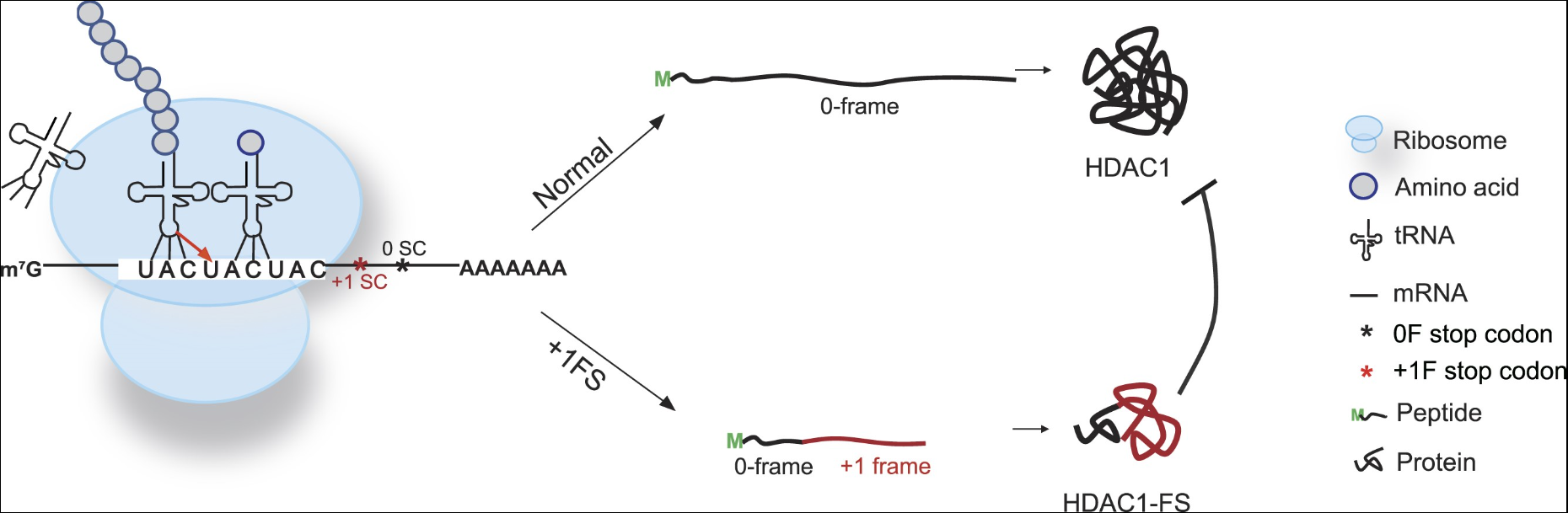 为了探索这些移码蛋白的功能,研究人员聚焦于在组蛋白去乙酰化酶HDAC1的mRNA内发生的CRFS。通过双荧光素酶报告系统、蛋白免疫印迹分析、FACS、IP-MS等实验,研究者不仅确认了CRFS发生于HDAC1 mRNA上游的(UAC)3密码子重复序列内,且其产生的移框蛋白HDAC1-FS可在17种人体组织检测到其存在。为了探索移框蛋白HDAC1-FS的功能,研究者通过一系列的实验研究,证明了HDAC1-FS是正常翻译的HDAC1蛋白的一种天然抑制因子,抑制H3K9ac上HDAC1的去乙酰化功能,从而抑制细胞迁移,并促进细胞凋亡。综上,该研究揭示了一类全新的翻译移码现象,对于我们了解人类基因组的编码方式和调控多样性打开了全新的视野。