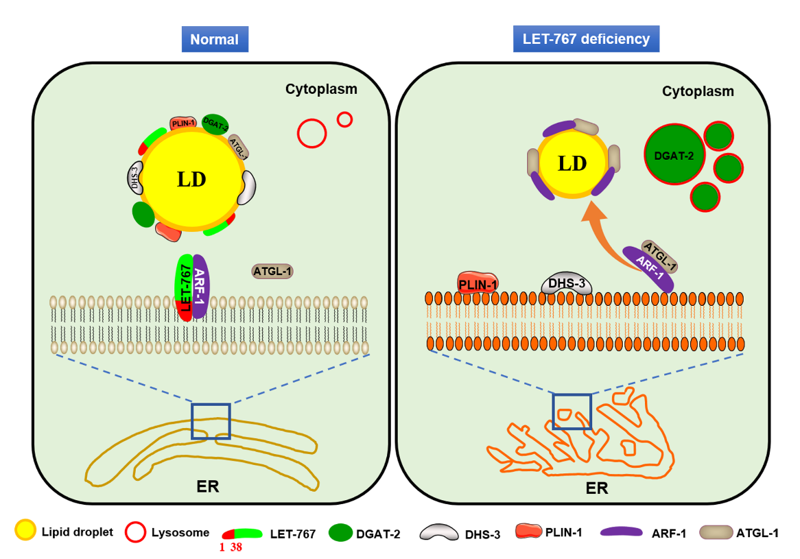 图 1 LET-767调控脂滴(LD)蛋白定位的模式图