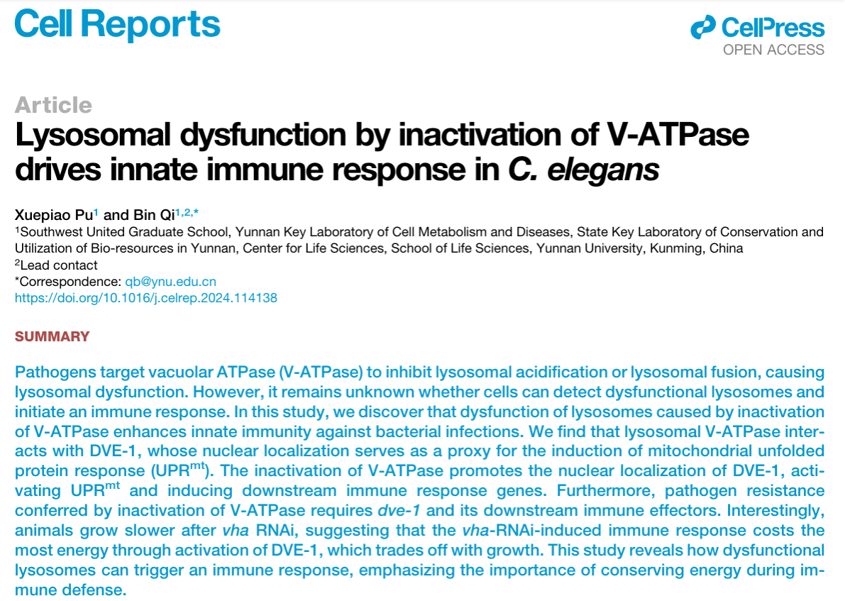 病原菌能够靶向V-ATPase,抑制溶酶体酸性和融合,从而导致溶酶体功能障碍。然而,细胞能否检测到功能失调的溶酶体并启动免疫反应的机制尚不清楚。2024428日,太阳成集团tyc122ccvip中心祁斌课题组在Cell Reports上以“Lysosomal dysfunction by inactivation of V-ATPase drives innate immune response in C. elegans”为题,报道了溶酶体功能紊乱(V-ATPase失活激活先天免疫的机制。