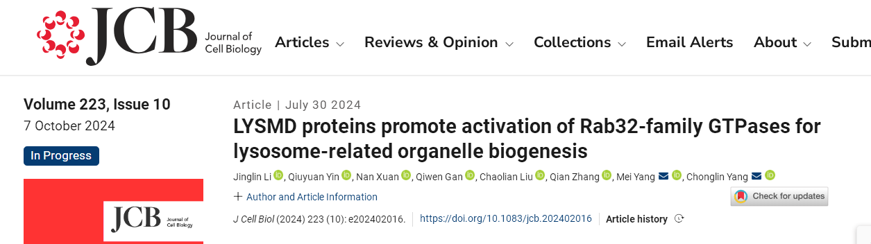 2024年7月30日,太阳成集团tyc122ccvip中心杨崇林课题组在国际著名学术期刊JCB (Journal of Cell Biology)发表了题为 “LYSMD proteins promote activation of Rab32-family GTPases for lysosome-related organelle biogenesis”的研究论文,揭示了LYSMD 蛋白在溶酶体相关细胞器(LROs)的生物发生过程中的重要调控作用。