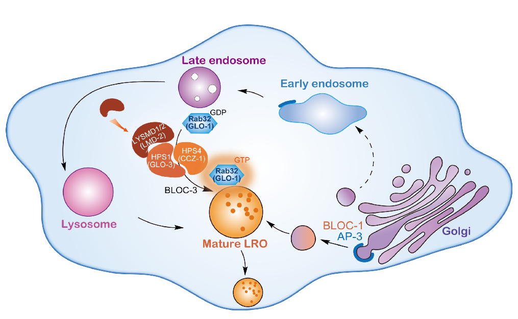 溶酶体相关细胞器 (Lysosome-related organelles LROs)是一类功能特化的溶酶体,在维持机体稳态中发挥重要作用,在不同类型细胞中有各自独特形态,组成和功能不尽相同,如黑色素体、血小板分泌颗粒、T淋巴细胞毒素等。LROs前体不断接收底物,逐渐与膜泡融合形成一个适合发挥功能的腔内环境,最后成为成熟的LROs。这类细胞器的功能紊乱会导致多种人类疾病,如赫曼斯基-普德拉克综合征等。然而, LROs生物发生的分子机制尚未完全阐明。
