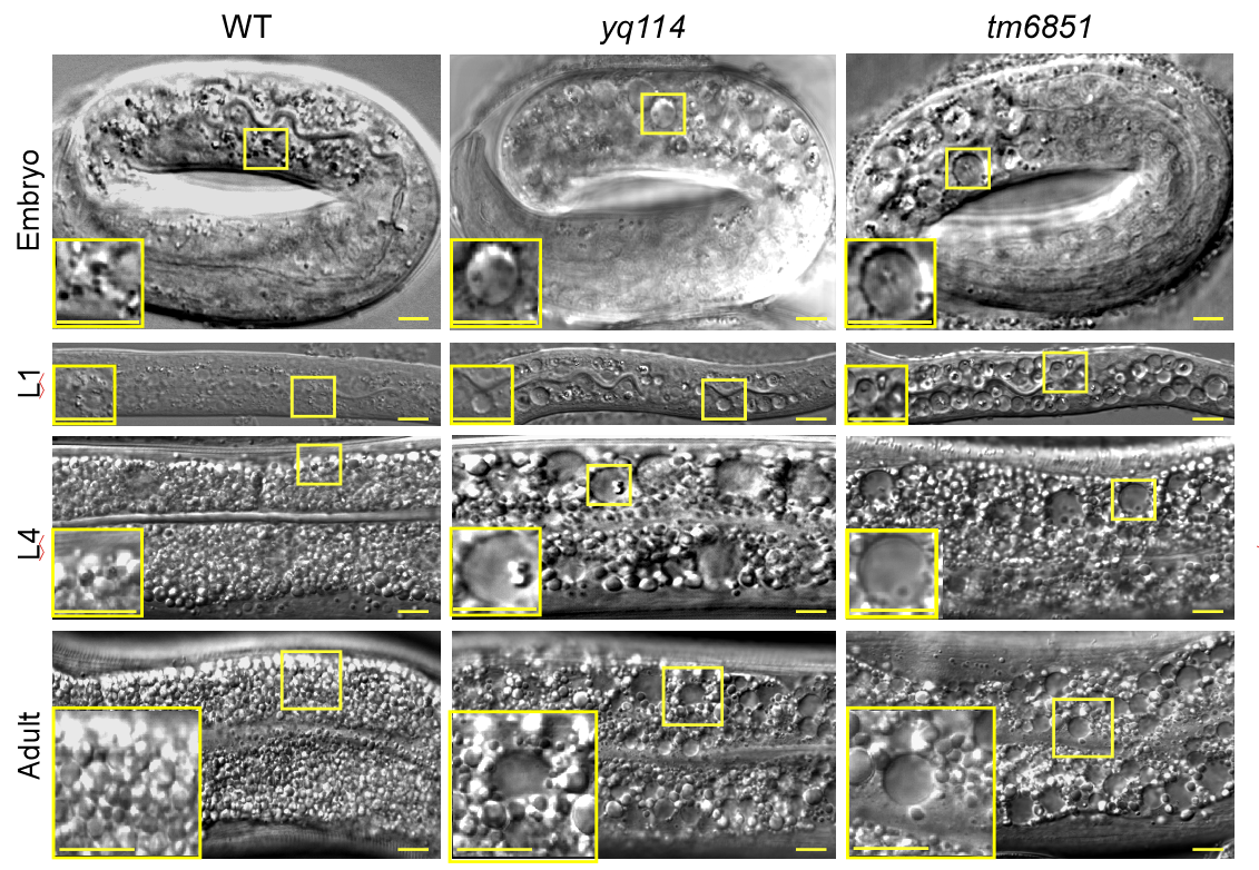 图1. 秀丽隐杆线虫(C. elegans) lmd-2突变体(yq114和tm6851)在不同发育时期表现出肠道LROs异常增大。