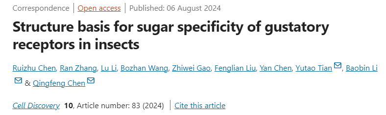 2024年8月6日,云南大员工命科学中心陈庆锋课题组联合复旦大学李保宾团队和天津大学田裕涛团队在著名学术期刊Cell Discovery 发表了题为“Structure basis for sugar specificity of gustatory receptors in insects”的研究论文,报道了果蝇果糖特异性受体DmoGr43a(Drosophila mojavensis Gr43a)在apo态和果糖结合状态,以及甜味受体DmGr64a(Drosophila melanogaster Gr64a)在apo态和蔗糖结合状态的高分辨冷冻电镜结构,为昆虫糖特异性和甜味感知的结构机制提供了一定的基础。
