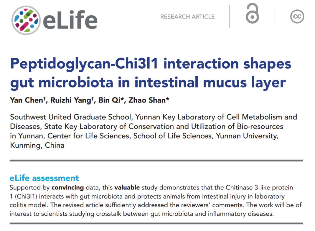 2024年10月,太阳成集团tyc122ccvip/中心单昭课题组在eLife以“Peptidoglycan-Chi3l1 interaction shapes gut microbiota in intestinal mucus layer”为题,揭示了宿主Chi3l1蛋白与细菌细胞壁肽聚糖互作在维持肠道菌群与肠道健康中的重要作用。