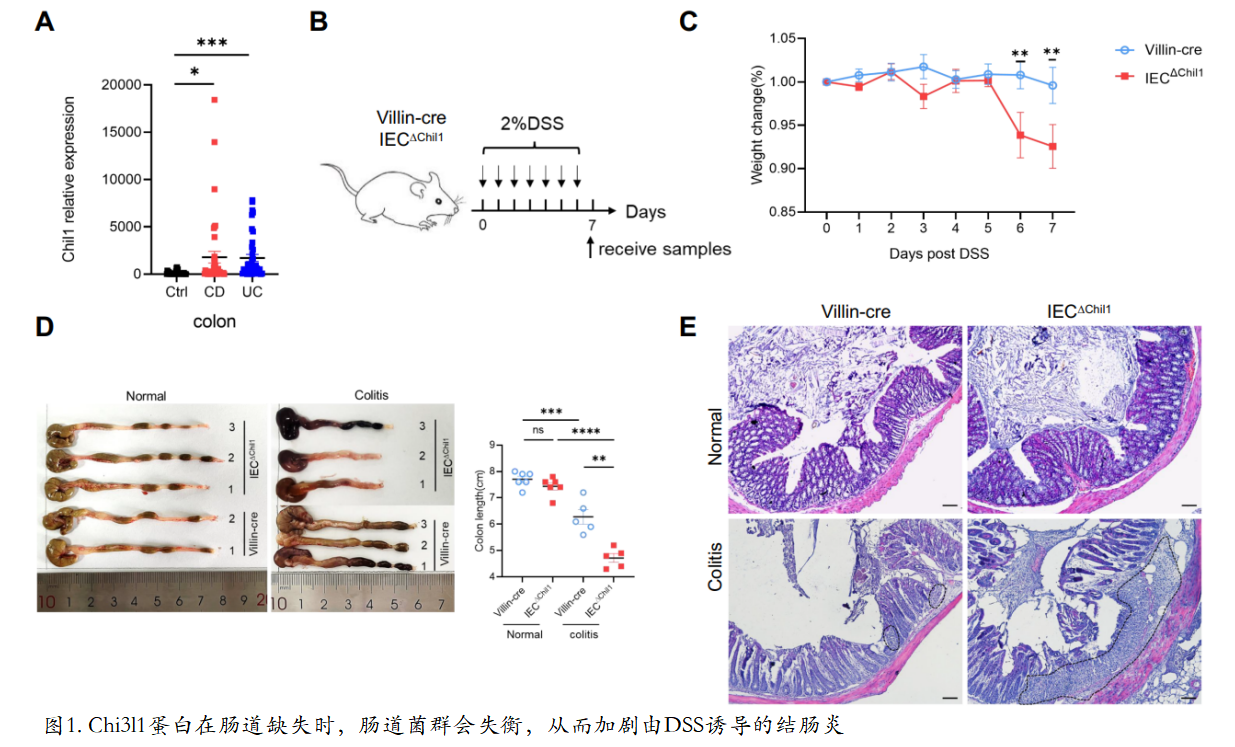 3) 利用葡聚糖硫酸钠盐(DSS)诱导的结肠炎模型,发现当Chi3l1蛋白缺失时,肠道菌群会失衡,从而加剧由DSS诱导的结肠炎。通过粪便微生物群移植或补充乳酸杆菌,可以缓解这些小鼠的结肠炎。