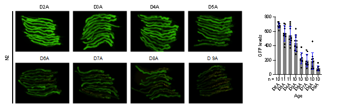 此外,多种延长寿命的干预措施,包括敲降daf-2、utx-1、cyc-1,二甲双胍处理和生殖系的缺少,都可以延缓衰老过程中GFP水平的下降速度。