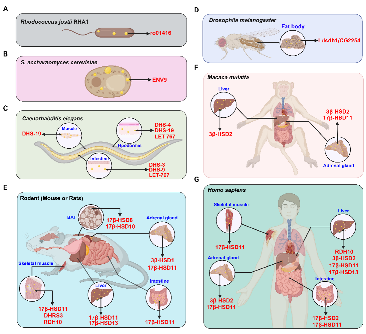 HSDs几乎存在于所有生物中,多个物种的不同组织的LD蛋白质组学均发现羟基类固醇脱氢酶成员(HSDs)。这些与LD-相关的HSDs蛋白最近被报道参与LD稳态调控,显示出除了经典的代谢酶功能外,HSDs还有更多的生物学功能。以17β-HSDs家族成员为例,其在各类脂滴(TAG-LDCE-LDRE-LD)蛋白组学中均有发现,但是它们在不同的物种中具有不同的功能。其中,秀丽线虫中的17β-HSDs蛋白调控TAG的稳态,梁斌团队今年的研究发现LET-767(与17β-HSD3/12同源)调控LD蛋白定位并维持脂质稳态(Journal of Cell Biology, 2024);哺乳动物中的17β-HSD11作为一种ERTOLD的蛋白促进脂质积累,17β-HSD12参与肥胖和黄病毒科感染,17β-HSD13则与代谢功能障碍相关脂肪变性肝病(MASLD)、肝炎(MASH)相关。因此,了解这些与LD相关的HSDs蛋白如何发挥新功能调节脂滴和脂质稳态、以及在人类疾病中的作用等,是未来一个重要的研究新领域,有望对人类代谢性疾病和病毒感染带来新疗法。