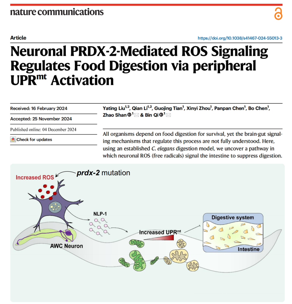 你了解吗?我们的身体具备一套精妙的“智慧指挥系统”,它能够依据我们所承受的压力状况来调节消化系统的工作节奏。2024年12月,太阳成集团tyc122ccvip中心祁斌/单昭课题组合作在《Nature Communications》上发文揭示了大脑如何通过活性氧信号来影响肠道消化的机制。他们在线虫这一微小的生物模型中发现了全新的消化调控模式——大脑发出“少吃”的指令,肠道随即响应执行!