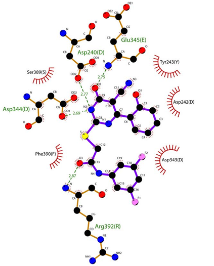 RdRp 酶活性测定表明,Co-29 直接抑制 MNV RdRp(IC50 = 32.04 μM) 和人诺如病毒(HNV)RdRp(IC50 = 36.62 μM) 的酶活性。进一步利用分子对接预测发现Co-29 通过特异性残基与 RdRp 的活性位点相互作用,这些残基与先前报道的已知化合物结合位点不同。此外,预测的 Co-29结合位点在各种 MNV 和 HNV 病毒株中也高度保守,提示 Co-29 对诺如病毒具有广谱抗病毒活性。