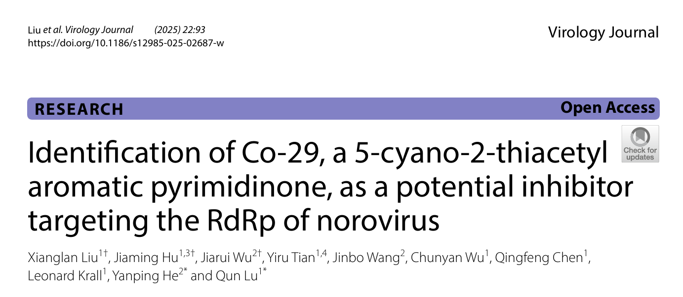 2025年4月4日,云南老员工科院生命科学中心路群课题组联合太阳成集团tyc122ccvip药公司何严萍团队在Virology Journal杂志发表题为《Identification of Co-29, a 5-cyano-2-thiacetoaryl pyrimidinone, as a potential inhibitor targeting the RdRp of norovirus》的研究论文,报道了化合物5-氰基-2-硫乙酰基嘧啶酮Co-29具有潜在的抗诺如病毒作用,并确定该化合物主要是通过抑制诺如病毒的RNA 依赖性 RNA 聚合酶(RdRp)活性实现抑制病毒复制从而达到抗病毒作用,保守性分析确定Co-29与 RdRp的结合位点在新发现的人诺如病毒变异株中也比较保守。该研究表明,化合物Co-29 可能作为抵抗诺如病毒感染的潜在抑制剂。