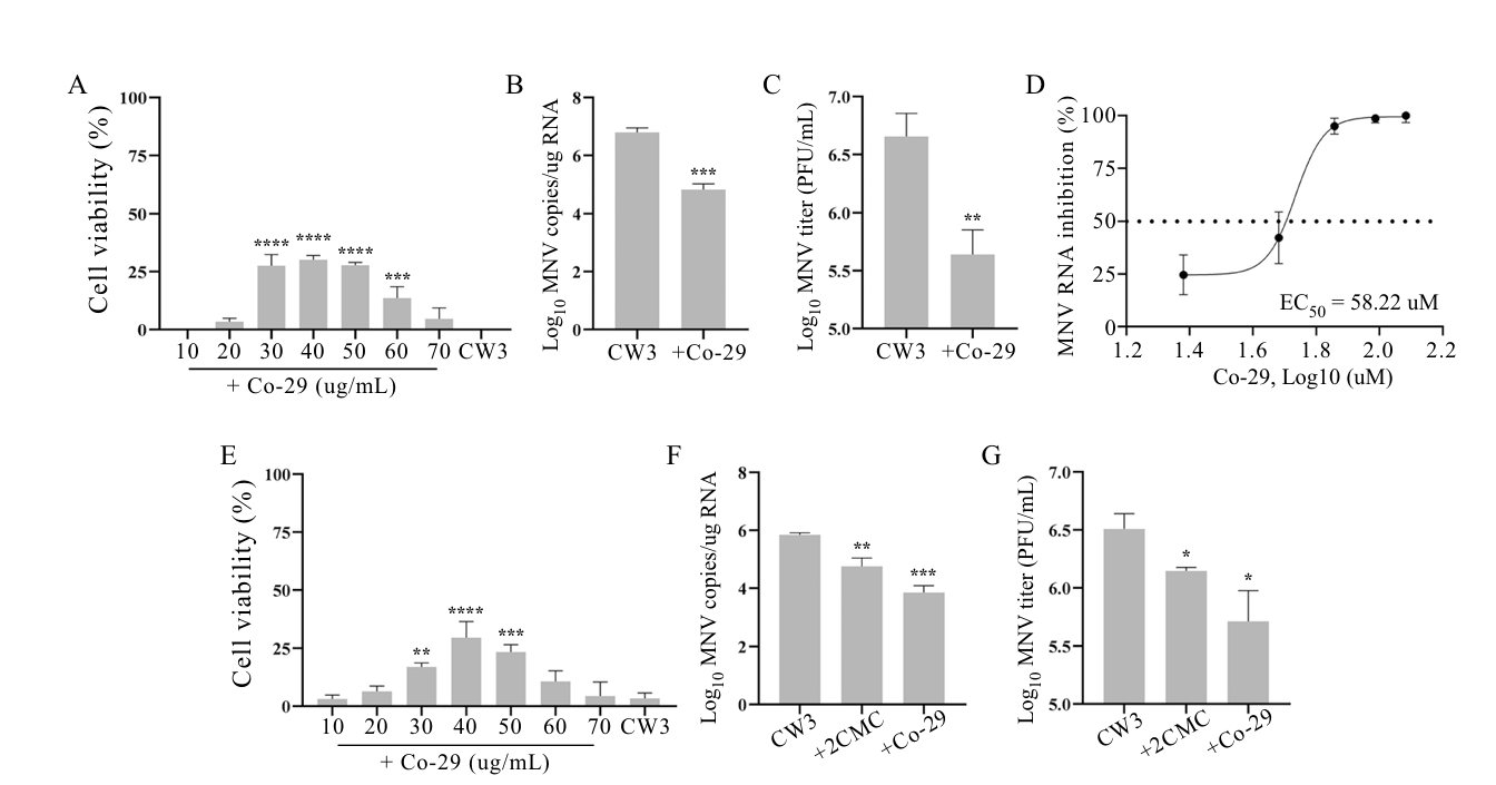 本研究以 HCV RdRp 抑制剂 3jc和 ZIKV RdRp 抑制剂 4w为先导化合物,采用分子杂交法合成了41个5-氰基-2-噻乙酰芳香族嘧啶酮的化合物库。在细胞培养系统中使用鼠诺如病毒(MNV)进行体外感染并筛选具有抗病毒的活性小分子化合物。MNV 能够在小鼠巨噬细胞如小鼠小胶质细胞 BV2 细胞系和RAW 264.7细胞系中进行复制并且最终诱导细胞死亡。基于细胞活力筛选发现化合物 Co-29 具有潜在的抗诺如病毒活性。在两种不同细胞系中Co-29 处理致使两种 MNV 病毒株感染能显著增加活细胞数量,并且也能有效抑制 MNV RNA复制