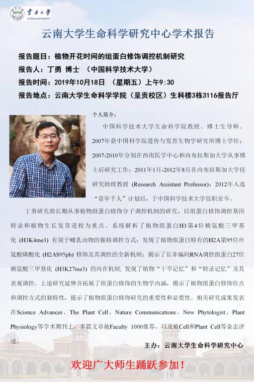 当前位置: 首页>>讲座信息>>学术讲座>>正文 太阳成集团tyc122ccvip中心学术报告 - 中国科学技术老员工命科公司丁勇教授 “植物开花时间的组蛋白修饰调控机制研究” 发布时间: 2019年10月17日 09:16 阅读次数: 报告题目:植物开花时间的组蛋白修饰调控机制研究 报告人:丁勇 博士 (中国科学技术大学) 报告时间:2019年10月18日 (星期五)上午9:30 报告地点:太阳成集团tyc122ccvip(呈贡校区)生科楼3栋3116报告厅