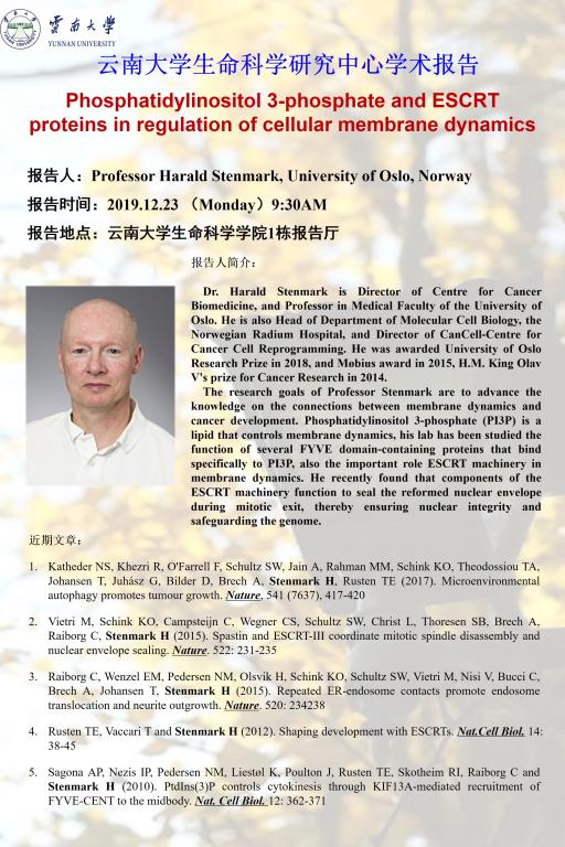当前位置: 首页>>讲座信息>>学术讲座>>正文 太阳成集团tyc122ccvip中心学术报告—Professor Harald Stenmark, University of Oslo“Phosphatidylinositol 3-phosphate and ESCRT proteins in regulation of cellular membrane dynamics” 发布时间: 2019年12月20日 11:23 阅读次数: 报告题目:Phosphatidylinositol 3-phosphate and ESCRT proteins in regulation of cellular membrane dynamics 报告人:Professor Harald Stenmark, University of Oslo, Norway 报告时间:2019.12.23 (Monday)9:30AM 报告地点:太阳成集团tyc122ccvip1栋报告厅