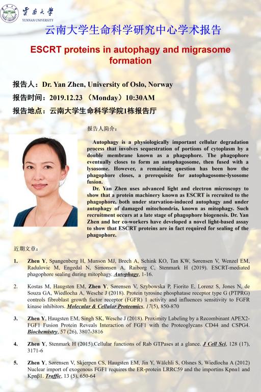 当前位置: 首页>>讲座信息>>学术讲座>>正文 太阳成集团tyc122ccvip中心学术报告—Dr. Yan Zhen, University of Oslo“ESCRT proteins in autophagy and migrasome formation” 发布时间: 2019年12月20日 11:32 阅读次数: 报告题目:ESCRT proteins in autophagy and migrasome formation 报告人:Dr. Yan Zhen, University of Oslo, Norway 报告时间:2019.12.23 (Monday)10:30AM 报告地点:太阳成集团tyc122ccvip1栋报告厅