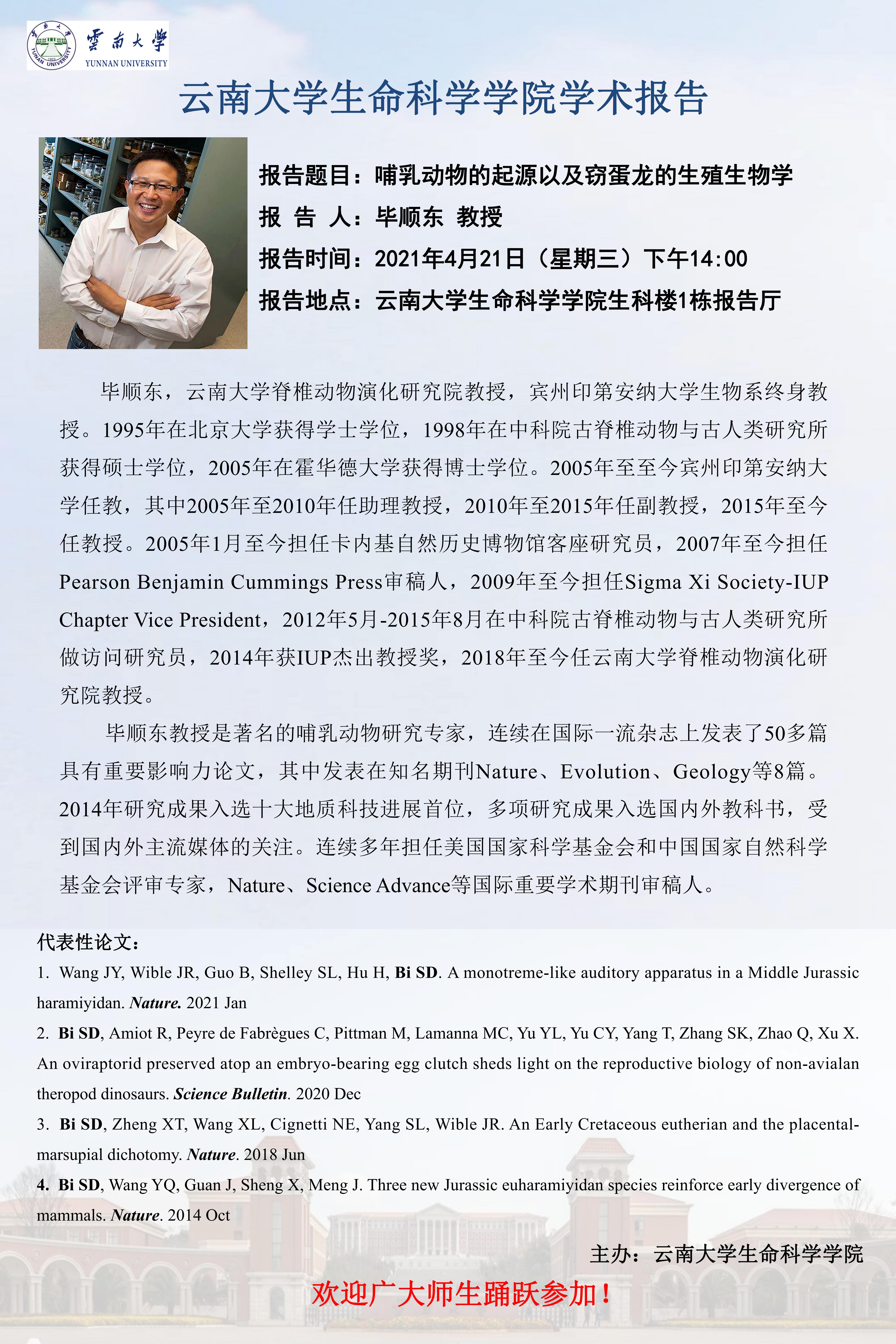 栏目导航 导航 栏目导航 首页 关于我们 太阳成集团tyc122ccvip简介 党政工团 行政办公 新闻通知 太阳成集团tyc122ccvip新闻 通知公告 团队队伍 细胞生物学 生物化学与分子生物学 遗传学 微生物学 生物信息学 进化生物学 当前位置: 首页>>讲座信息>>学术讲座>>正文 哺乳动物的起源以及窃蛋龙的生殖生物学 发布时间: 2021年04月20日 10:15 阅读次数: