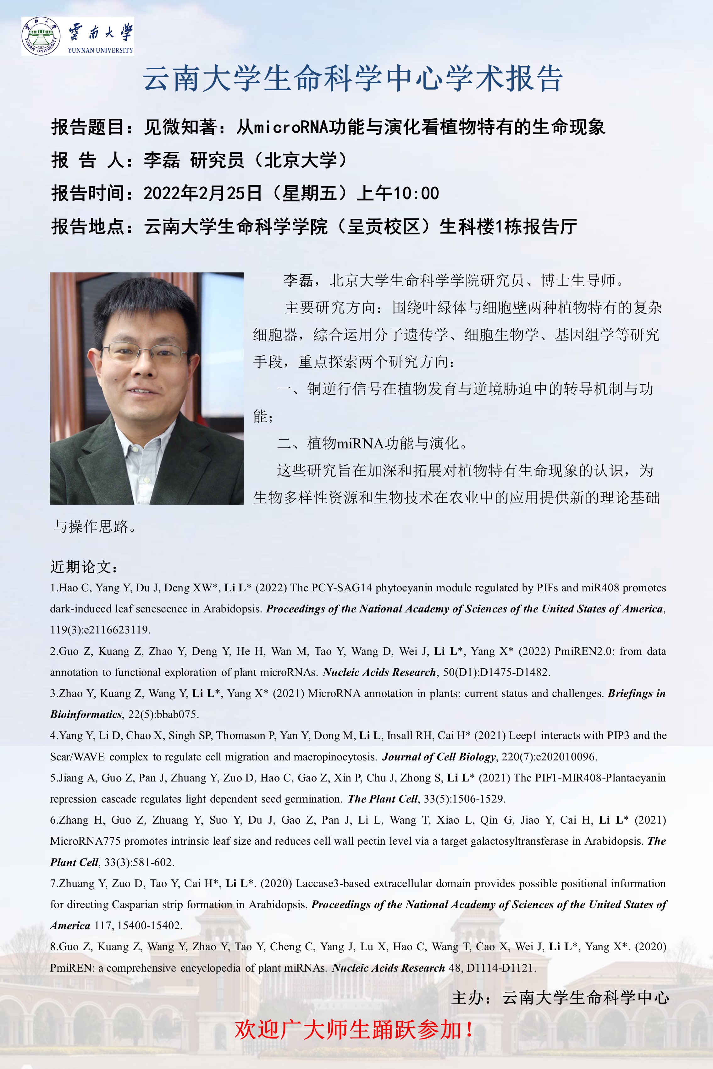 栏目导航 导航 栏目导航 首页 关于我们 太阳成集团tyc122ccvip简介 党政工团 行政办公 新闻通知 太阳成集团tyc122ccvip新闻 通知公告 团队队伍 细胞生物学 生物化学与分子生物学 遗传学 微生物学 生物信息学 进化生物学 当前位置: 首页>>讲座信息>>学术讲座>>正文 见微知著:从microRNA功能与演化看植物特有的生命现象 发布时间: 2022年03月01日 22:49 阅读次数: