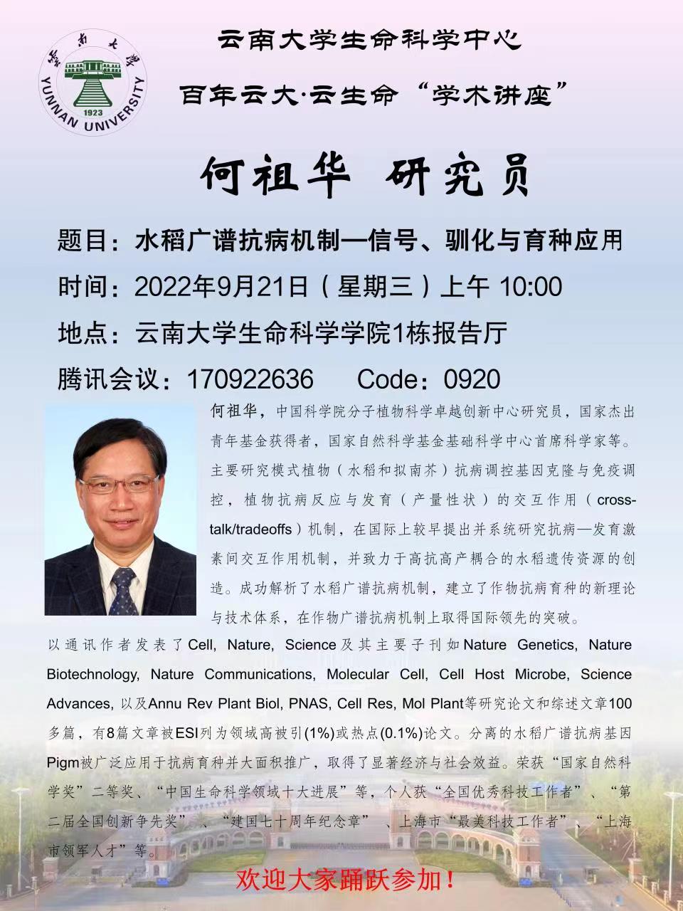 栏目导航 导航 栏目导航 首页 关于我们 太阳成集团tyc122ccvip简介 党政工团 行政办公 新闻通知 太阳成集团tyc122ccvip新闻 通知公告 团队队伍 细胞生物学 生物化学与分子生物学 遗传学 微生物学 生物信息学 进化生物学 当前位置: 首页>>讲座信息>>学术讲座>>正文 水稻广谱抗病机制—信号、驯化与育种应用 发布时间: 2022年09月20日 14:26 阅读次数: