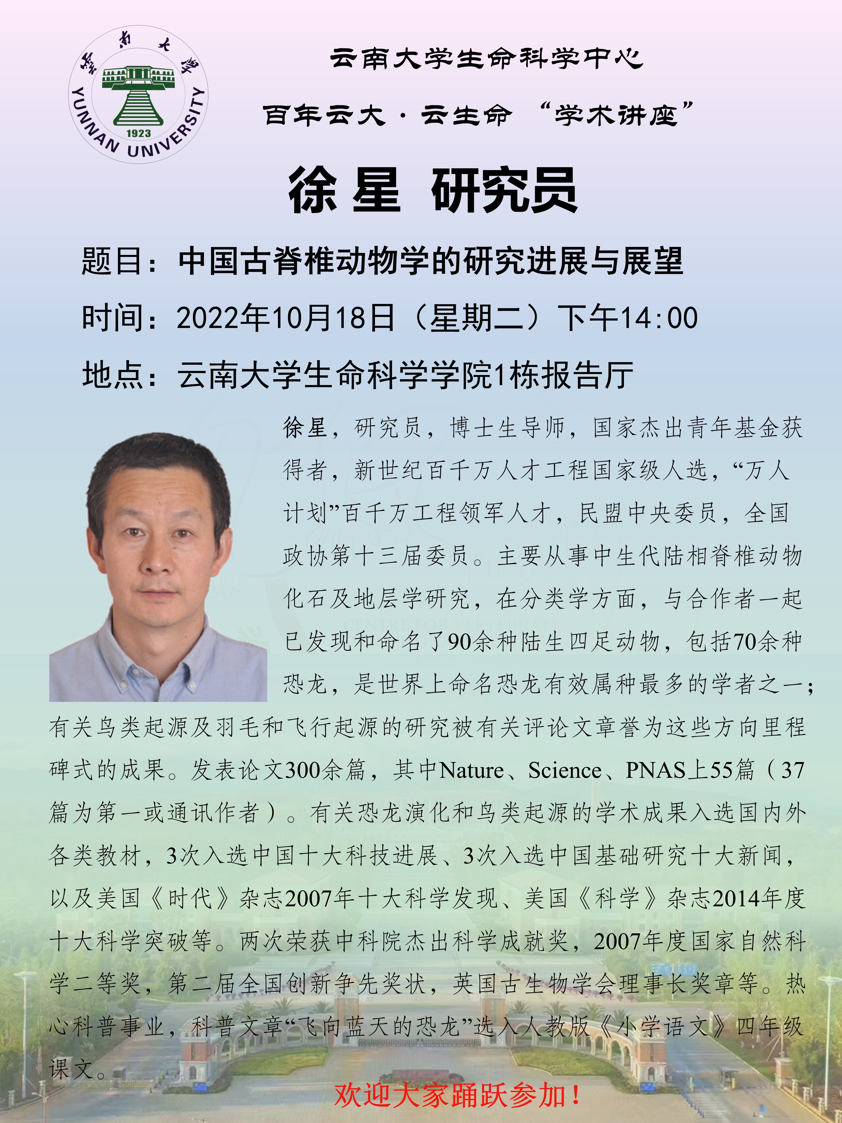 栏目导航 导航 栏目导航 首页 关于我们 太阳成集团tyc122ccvip简介 党政工团 行政办公 新闻通知 太阳成集团tyc122ccvip新闻 通知公告 团队队伍 细胞生物学 生物化学与分子生物学 遗传学 微生物学 生物信息学 进化生物学 当前位置: 首页>>讲座信息>>学术讲座>>正文 中国古脊椎动物学的研究进展与展望 发布时间: 2022年10月14日 16:24 阅读次数: