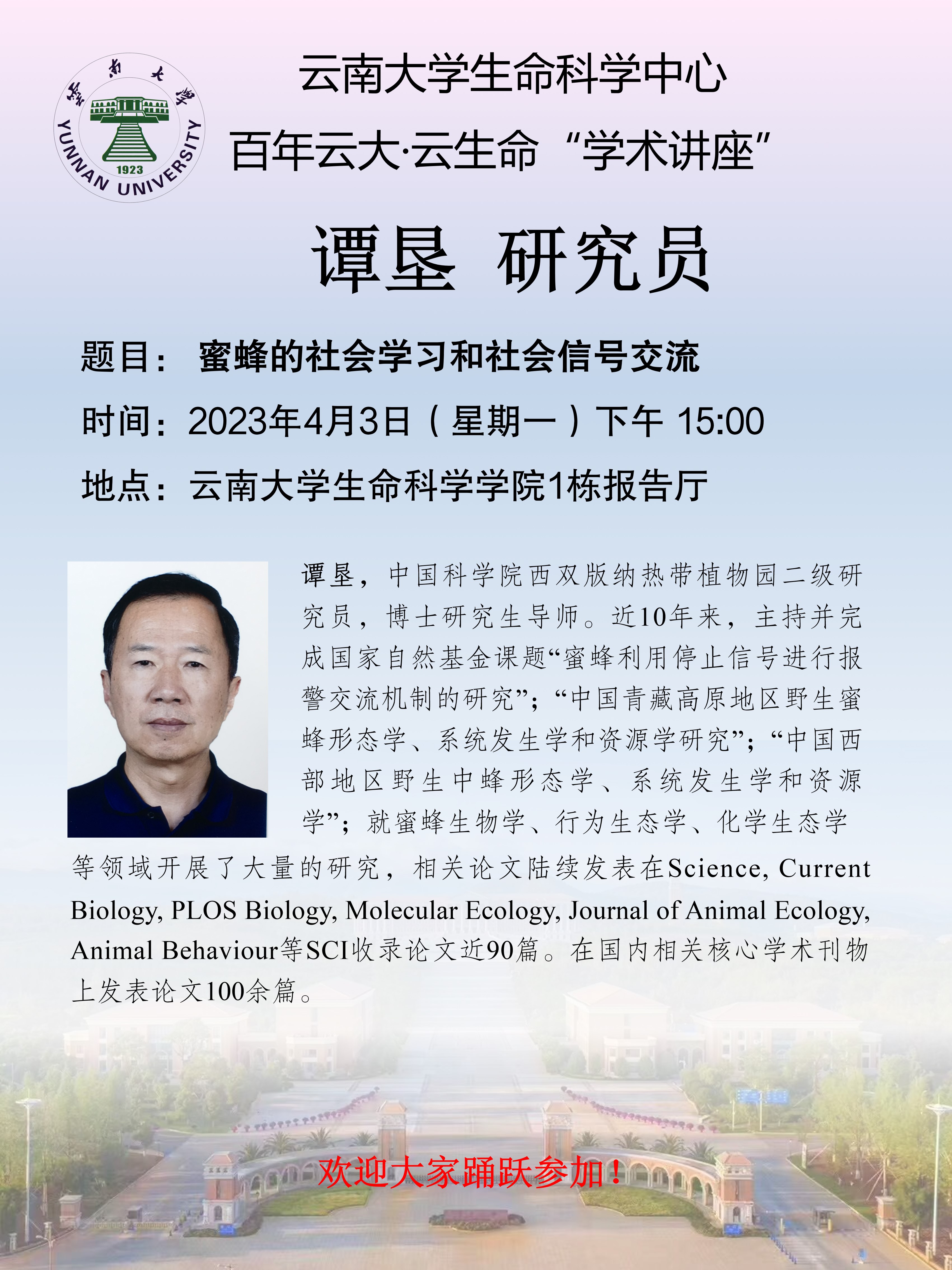 栏目导航 导航 栏目导航 首页 关于我们 太阳成集团tyc122ccvip简介 党政工团 行政办公 新闻通知 太阳成集团tyc122ccvip新闻 通知公告 团队队伍 细胞生物学 生物化学与分子生物学 遗传学 微生物学 生物信息学 进化生物学 当前位置: 首页>>讲座信息>>学术讲座>>正文 蜜蜂的社会学习和社会信号交流 发布时间: 2023年03月28日 14:54 阅读次数: