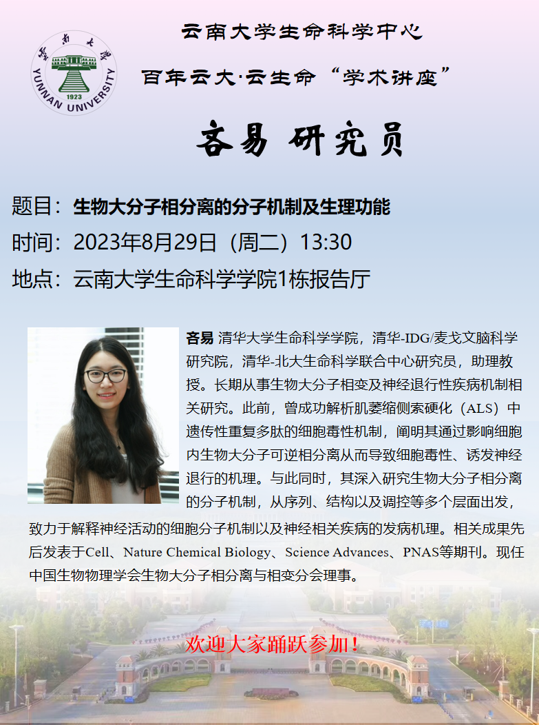 栏目导航 导航 栏目导航 首页 关于我们 太阳成集团tyc122ccvip简介 党政工团 行政办公 新闻通知 太阳成集团tyc122ccvip新闻 通知公告 团队队伍 细胞生物学 生物化学与分子生物学 遗传学 微生物学 生物信息学 进化生物学 当前位置: 首页>>讲座信息>>学术讲座>>正文 生物大分子相分离的分子机制及生理功能 发布时间: 2023年08月29日 08:59 阅读次数: